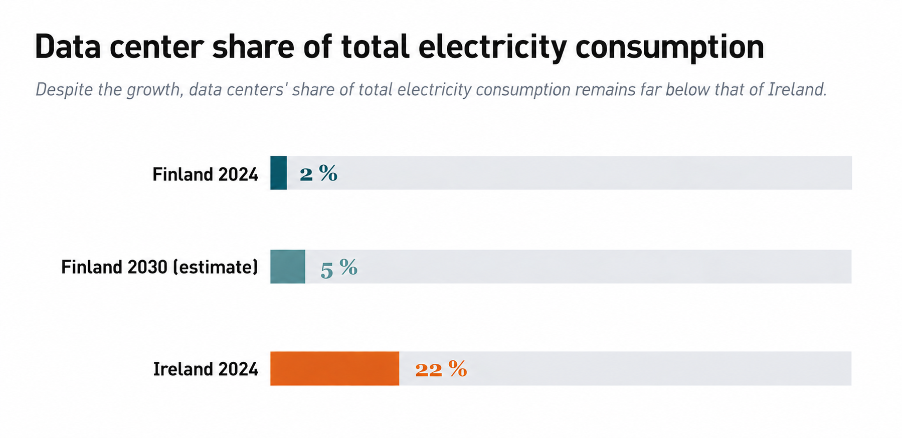 The situation in Finland is very different from that in Ireland, for example, where data centers consumed 22% of electricity in 2024. Ireland’s electricity market is about one-third the size of Finland’s, and electricity is expensive due to the high share of natural gas in production, which is subject to emissions trading. In Finland, low-carbon electricity production – i.e., production not subject to emissions trading – accounts for 96%.